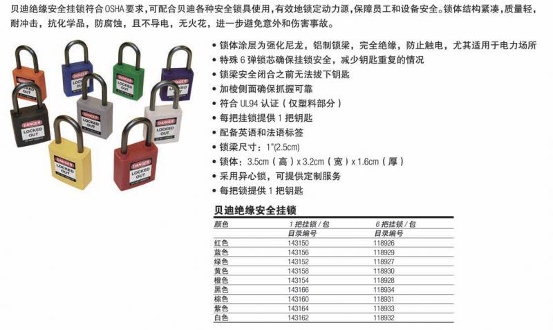 功能最強(qiáng)的上鎖鎖具:貝迪安全掛鎖符合所有OSHA要求,可用于安全替代上鎖過(guò)程里使用的金屬鎖具。鎖體絕緣,獨(dú)特的鎖心可防止電流從鎖梁傳至鑰匙,從而進(jìn)一步提高了觸電防護(hù)性能。貝迪安全掛鎖還具有一定的防腐蝕性能。第三方檢測(cè)證明貝迪產(chǎn)品在重復(fù)鹽水噴霧試驗(yàn)條件下的性能卓越。